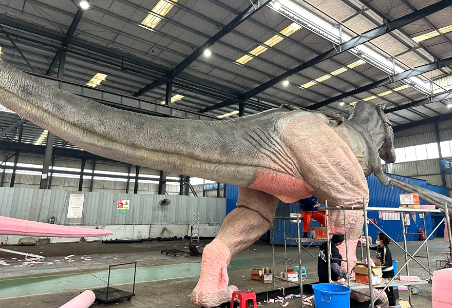 The skin is what makes the dinosaur look realistic and also makes it durable and waterproof. First, the artists stretch an elastic fabric over the dinosaur to reinforce the skin. Then, they mix silicone glue with gasoline (as a thinner) and brush it evenly over the fabric to make it waterproof. This process usually takes 2-3 days.