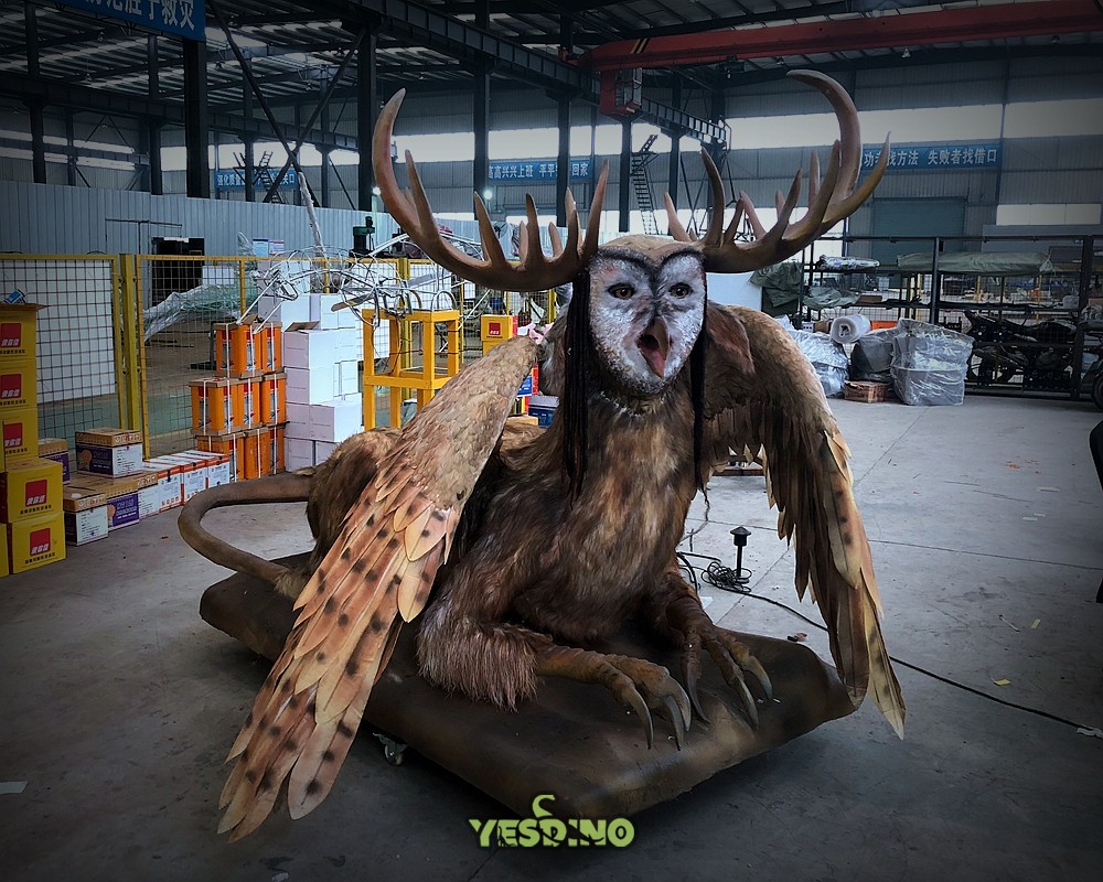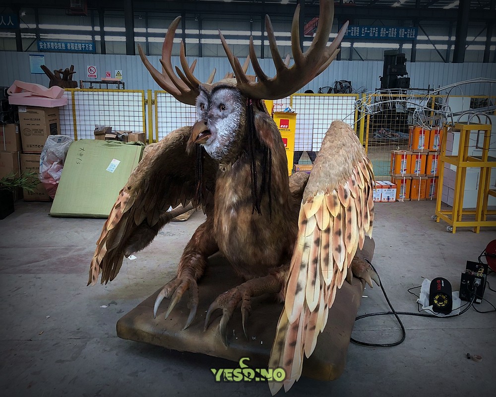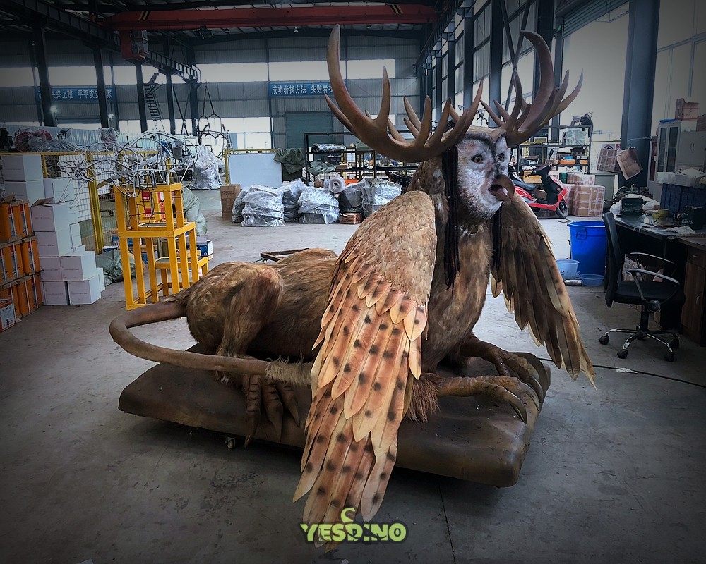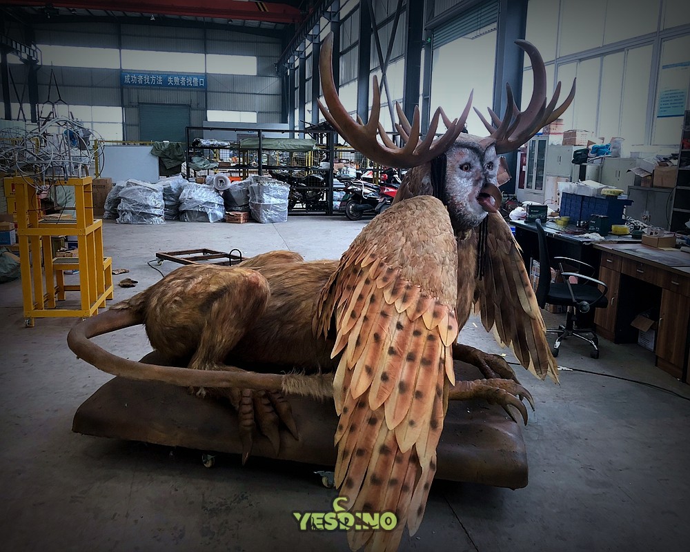This is an innovative animatronic monster model that combines the facial features of an owl, the body features of a lion, and the wings of an eagle. Both the face and the body adopt the process of pasting simulated fur, and the wings are made of real feathers. The whole model looks vivid and lifelike. It can perform actions such as shaking its head, blinking its eyes, wagging its tail, and flapping its wings, and it can also make sounds. It is suitable for occasions such as monster-themed amusement parks, animation exhibitions, and decorative items in children's playgrounds. It can be placed and exhibited in combination with images such as Western dragons and fire-breathing dragons. |