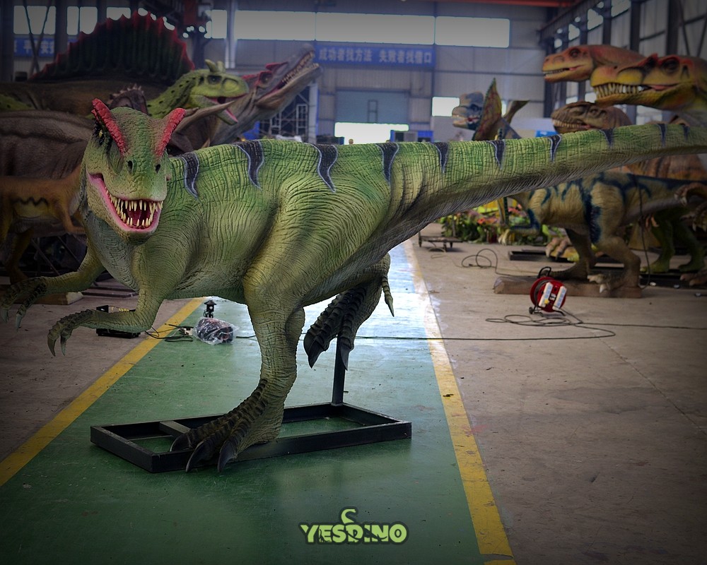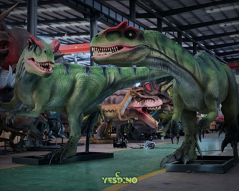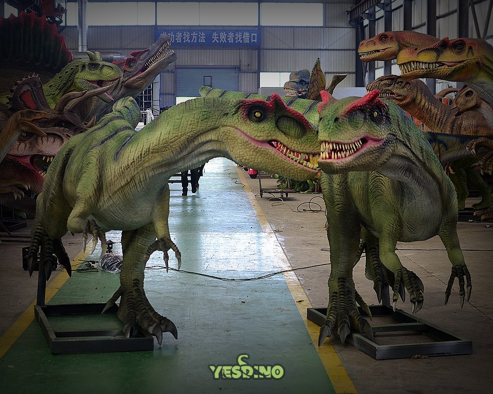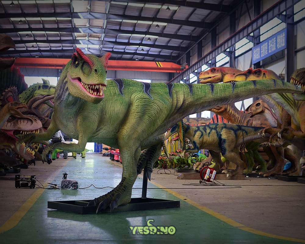 A animatronic dinosaur model with a lifelike appearance, equipped with mechanical structures and motors to simulate dinosaur movements. |