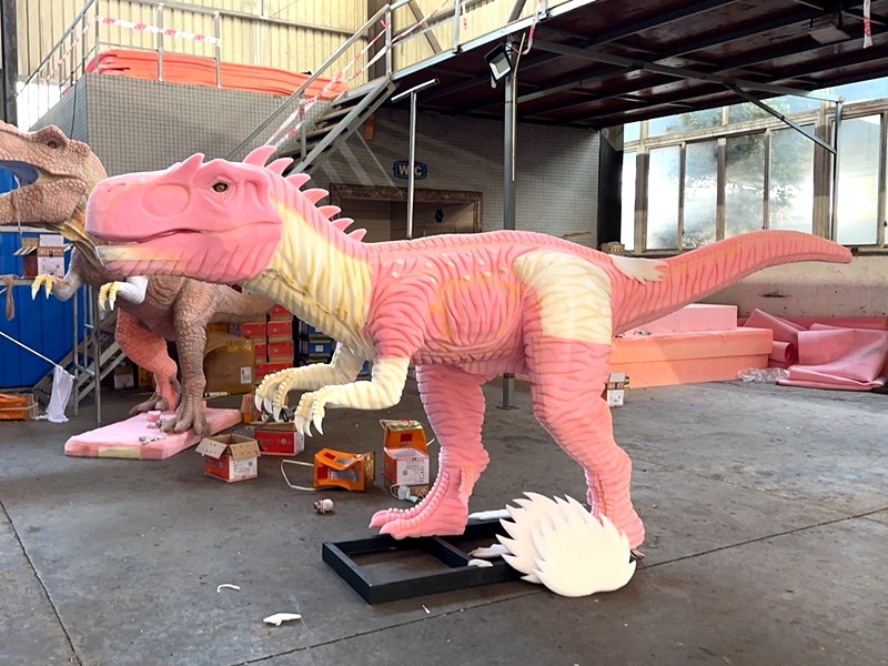 Body undulates and sways, eyes blink, mouth opens and roars, tail swings, head turns left and right, and claws wave. |